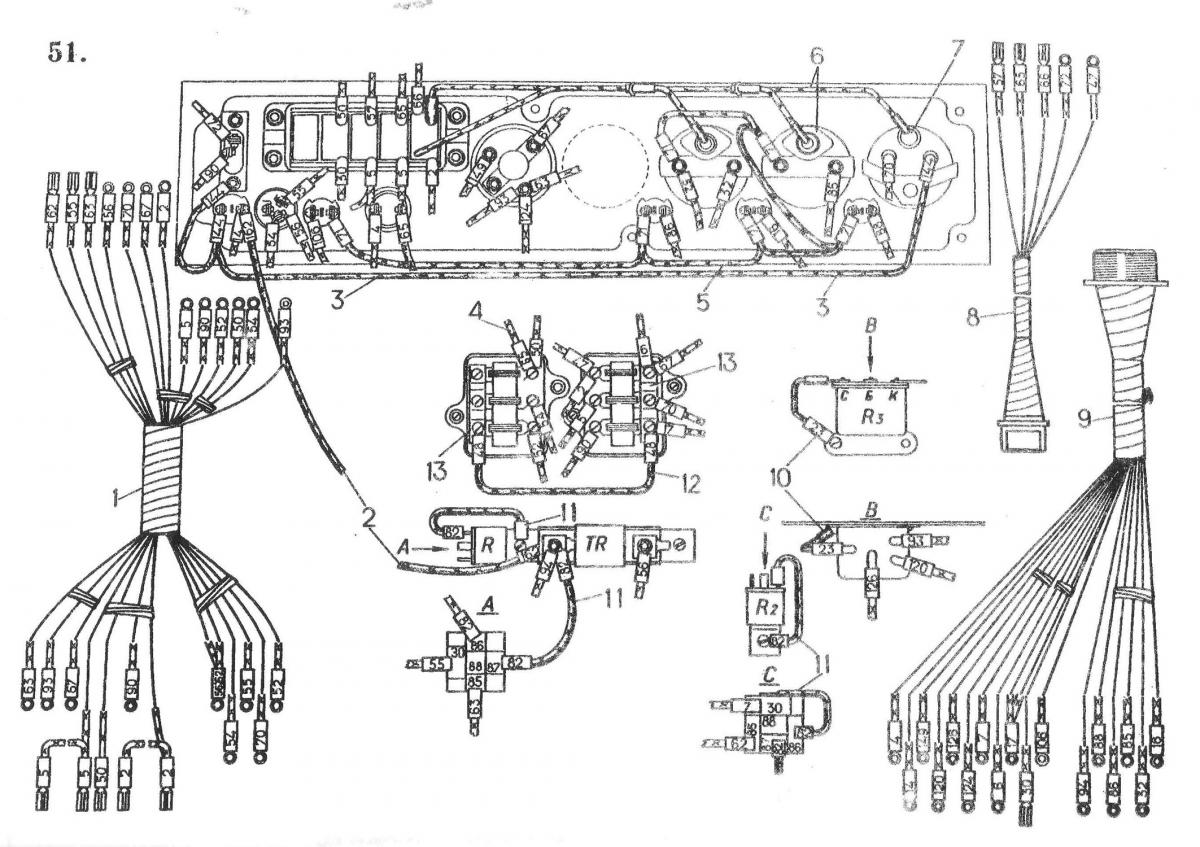 Подсоединение проводов и жгутов к приборам щитка 50-10-427СП